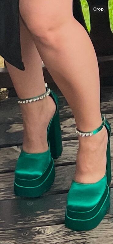 Drugi materijalZelene platform sandale sa visokom blok štiklom i satenskim sjajem. Zatvorena kvadratna kapica, dvostruka platforma napred za dodatnu stabilnost i efekat produženih nogu. Oko zgloba se nalazi tanak kaiš u istoj boji sa ukrasnim kamenčićima i kopčom za podešavanje. Debela potpetica pruža sigurniji oslonac pri hodu, dok glatka, sjajna površina daje luksuzan izgled. Idealne za večernje izlaske, svečane prilike i modne kombinacije kojima treba upečatljiv akcenat u smaragdno zelenoj boji.