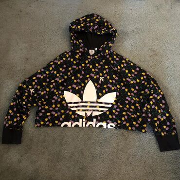 Adidas ženska dukserica s kapuljačom – crna sa zlatnim Trefoil printom - Model: Adidas Originals hoodie sa širokim, opuštenim krojem (kratkiji, “cropped” stil) - Boja: crna baza sa višestrukim zla...Adidas ženski crop duks s kapuljačom