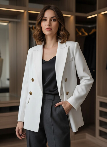 Elegantni beli ženski sako sa zlatnim dugmadima