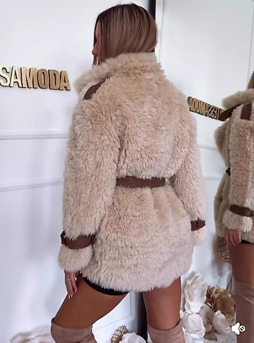 Krzneni kaput sa pojasom – bež - Model: kratak kaput od meke, bujne