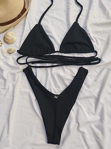 - Model: klasičan „triangle“ grudnjak sa vezivanjem oko vrata i leđa; gaćice visokog izreza sa dubokim V prednjim delom.