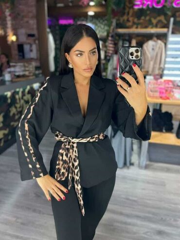 Leopard, krokodil, zebraElegantan ženski blejzer dostupan u crnoj i bež boji, sa dodatkom šala sa leopard printom koji se može vezati oko struka ili koristiti kao modni detalj. Blejzer ima klasičan kroj sa reverima i dužim rukavima, dok šal dodaje jedinstven i moderan izgled. Izrađen je od materijala koji omogućava udobno nošenje i pogodan je za različite prilike, od poslovnih sastanaka do večernjih izlazaka. Leopard print se takođe diskretno ponavlja na rukavima, dodajući kohezivnost dizajnu. Ovaj blejzer je odličan izbor za žene koje žele da istaknu svoj stil i dodaju dašak elegancije svojoj garderobi.