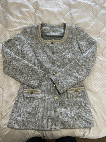 S (EU 36)Elegantni ženski sako/kaputić od tvida u sivoj boji, sa zlatnim detaljima oko kragne i na dzepovima.
