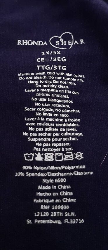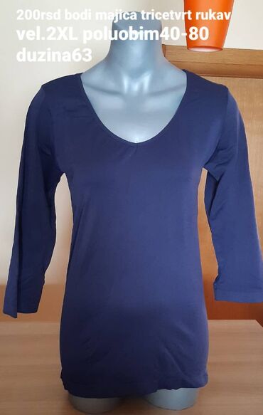 Bodi majica Rhonda Shear, tamnoplava, sa tričetvrt rukavima i V-izrezom. Veličina 2XL/3XL (oznaka 2X/3X). Materijal: 90% najlon, 10% elastan (spandeks) – rastegljiva i prijanja uz telo.