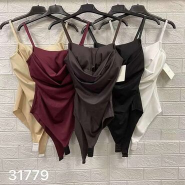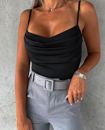 Ženski bodi sa tankim bretelama i kaskadnim (drapiranim) dekolteom. - Model: pripijeni kroj, duboki „cowl neck“ izrez, elastični materijal. - Zakopčavanje: kopča između nogu (praktично oblačenje i...