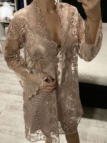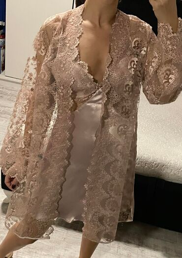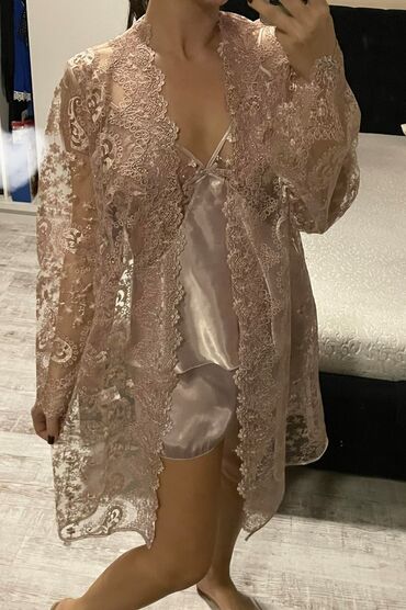 Elegantan ženski komplet veša, idealan za opuštanje kod kuće. Sastoji se od kratke spavaćice sa čipkastim detaljima i ogrtača od transparentne čipke. Spavaćica ima tanke bretele i V-izrez, dok ogrtač ima široke rukave i ukrasni čipkasti porub. Celokupni dizajn pruža udobnost i sofisticiran izgled. Ovaj set je praktičan izbor za svakodnevnu upotrebu, pružajući osećaj luksuza i opuštenosti.