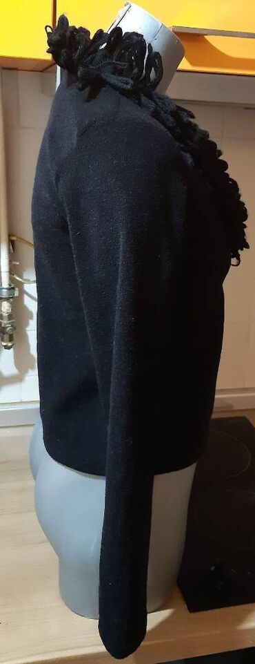 Pleten džemper sa šljokičastim detaljima - Boje: siva, crna i bela u prugastom/ombre dezenu - Ukras: tanke srebrne niti sa sitnim perlicama koje formiraju rese na prednjem delu; svetlucavi rub oko...