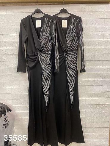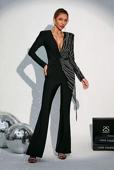 Elegantni ženski kombinezon – crni, dugački rukavi, duboki V izrez. Asimetričan prednji deo sa drapiranim čvorom u struku vizuelno sužava liniju i ističe siluetu. Jedna polovina je ukrašena sjajnim aplikacijama u talasastim/zebra motivima koje se nastavljaju od ramena, preko torza, niz nogavicu. Gornji deo je pripijen, nogavice su blago zvonaste, što produžava figuru i lepo pada preko štikli ili sandala. Materijal je elastičan i prijanja, pogodan za večernje izlaske, proslave i specijalne događaje.
