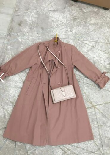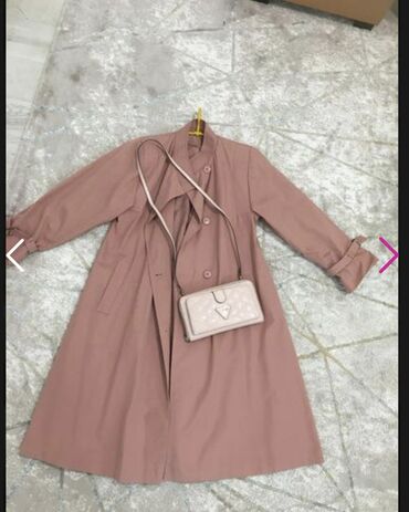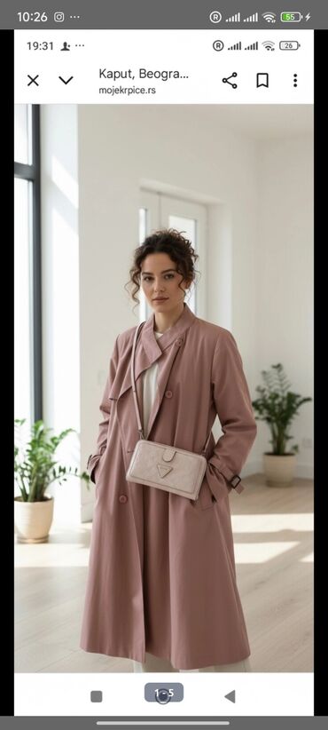 DugmadŽenski dugi kaput u puder-ružičastoj boji + mala torbica preko ramena u svetlo bež/ružičastoj nijansi.