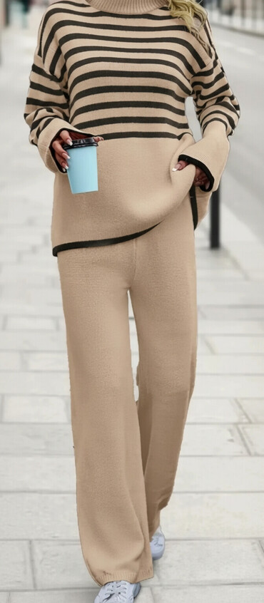 - Gornji deo: širok, mekan džemper sa rol-kragnom; pruge po celom telu, spuštena ramena, dugi rukavi sa kontrastnom tamnom ivicom na manžetnama; donja ivica takođe sa diskretnim tamnim obrubom