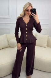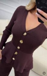 - Gornji deo: rebrasti dzemper na kopčanje, V-izrez, dugi rukavi. Struk naglašen peplum porubom koji formira ženstvenu siluetu. Dekorativna zlatna dugmad različitih reljefnih motiva.