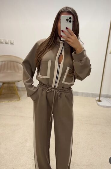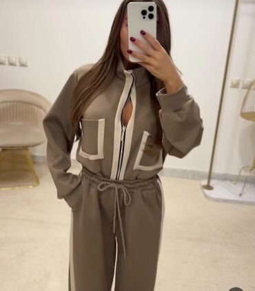 - Gornji deo: visoka kragna, centralni metalni rajsferšlus sa dekorativnim bež obrubom, diskretan prorez uz rajsferšlus, dva velika kvadratna našivena džepa napred