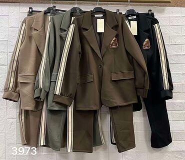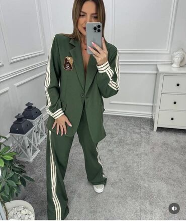 - Pantalone: visok/elastičan struk sa lastišem, ravnog i širokog kroja, bočne pruge u istom stilu kao na rukavima