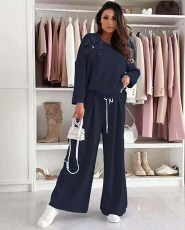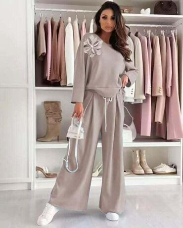 TurskaElegantan ženski dvodelni komplet, idealan za svakodnevne aktivnosti. Komplet se sastoji od ležerne bluze dugih rukava i širokih pantalona. Bluza ima okrugli izrez i ukrašena je cvetnim detaljem na ramenu, dok pantalone imaju široke nogavice i vezice u struku za podešavanje. Dostupan je u više boja, pružajući raznovrsnost za različite stilove.