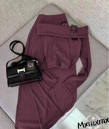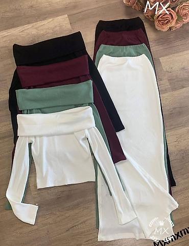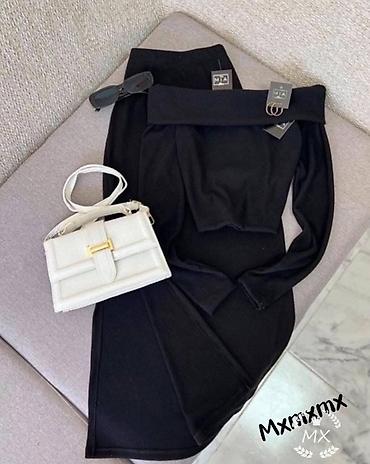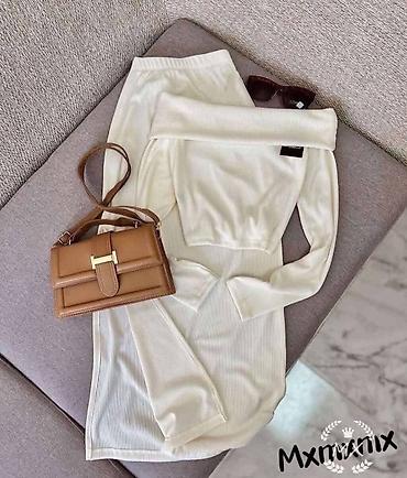 - Set se sastoji od uske midi suknje sa elastičnim pojasom i topa dugih rukava sa spuštenim/dekoltiranim ramenima.