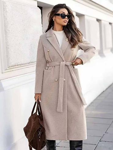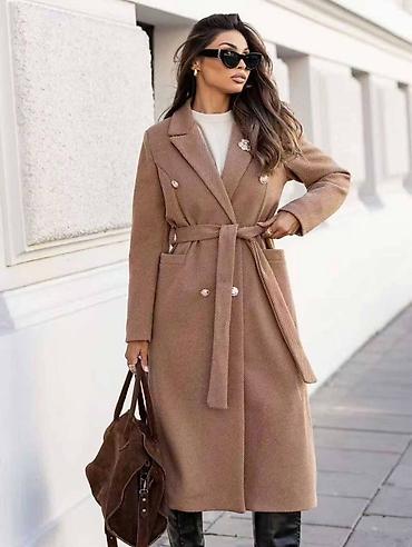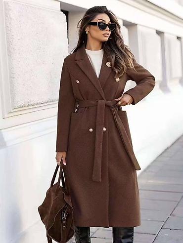 Elegantni ženski kaput – dužine ispod kolena, dvorednog kroja sa pojasom za vezivanje u struku. Klasičan rever sa iglom/brošem na reveru i dekorativnim zlatnim dugmadima ističe sofisticiran izgled. Tkanina je finog, diskretnog „herringbone“ (riblja kost) šara, prijatna i pogodna za jesen i zimu. Rukavi ravni, linija tela blago strukirana, sa čistim padom preko bokova za urednu siluetu.