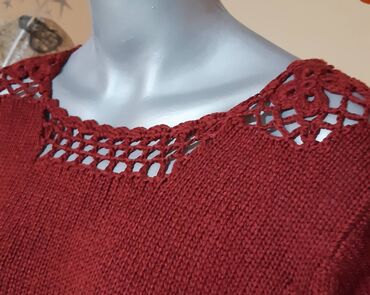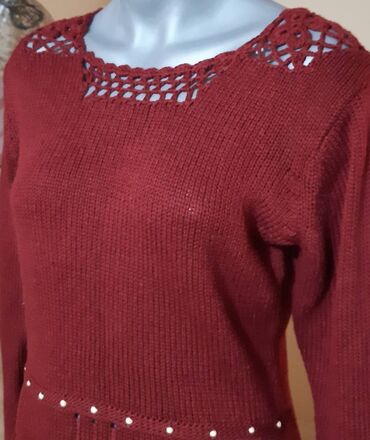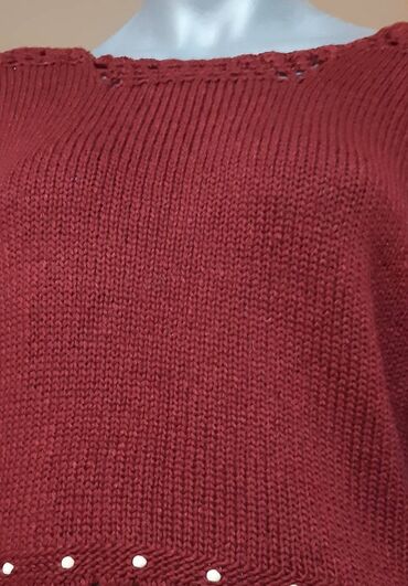 Džemper bordo boje sa dekorativnim heklanim detaljima oko izreza. Model sa dugim rukavima, blago strukiran, sa sitnim ukrasnim perlicama oko struka. Pletena, glatka tekstura tela, izrez blago čamac sa rupičastim motivom.
