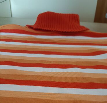 Ženski džemper s rol-kragnom, na pruge u nijansama crvene, narandžaste, kajsije i bele. Elastičan rebrasti rol-izrez, dugi rukavi i prianjajući kroj. Materijal je meki pleteni trikotaž, rastegljiv.