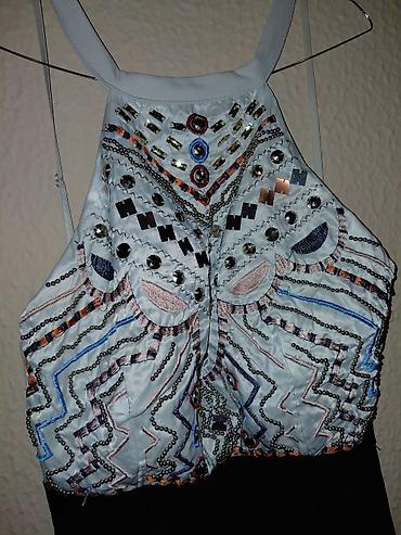 - Gornji deo: svetloplavi satenski/taftasti materijal sa bogatom ručnom dekoracijom – vez u više boja, perlice i sitne metalne aplikacije; visoka halter kragna sa ramenim trakama.