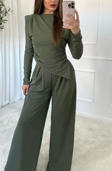 - Dizajn: Asimetrična bluza sa dugim rukavima i drapiranim preklopom u struku koji vizuelno sužava figuru; diskretno naglašena ramena. Pantalone su visokog struka sa faltama i veoma širokim nogavicama za lepršav, sofisticiran izgled.