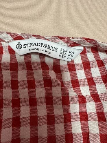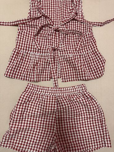 StradivariusKomplet Stradivarius topa i šortsa sa gingham dezenom u crvenoj i beloj boji. Top ima V-izrez sa kragnom, vezivanje napred i nabranu donju ivicu, pružajući udoban i ležeran kroj. Šorts je sa elastičnim strukom, što ga čini prikladnim za svakodnevno nošenje. Izrađen od laganog materijala, idealan je za letnje dane. Xs/s vel