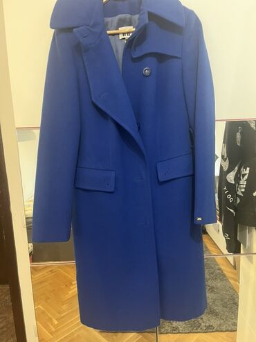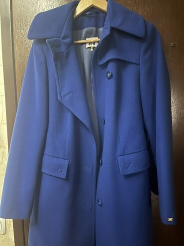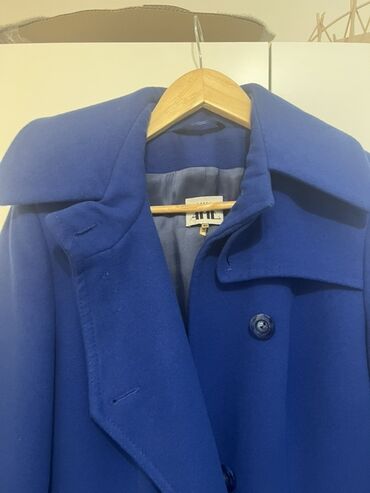 Teget ženski kaput, veličina L. - Kroj do kukova, strukiran, naglašava figuru - Dvostruki red dekorativnih dugmadi napred i na pojasu pozadi - Klasična rever-kragna - Dva bočna džepa - Postava u i...