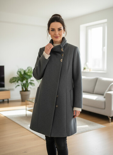 Ženski kaput ALVINA, elegantnog kroja u sivoj boji.