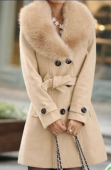 Ženski elegantni kaputi sa skidajućim krznom na kragni. Dvoredno kopčanje, struk naglašen kaišem, ukrasni manžetni dugmići i bočni džepovi. Mekan, topao materijal, klasična dužina iznad kolena. Više boja: bež, siva, bordo.