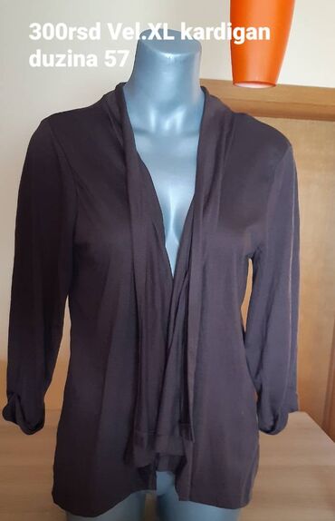 Pleten kardigan na dugmad, svetloplave boje sa belim cvetnim dezenom. V-izrez sa rebrastim porubom i kontrastnim belim prugama duž ivica i na manžetnama. Tri plava dugmeta napred, blago puf rukavi ...