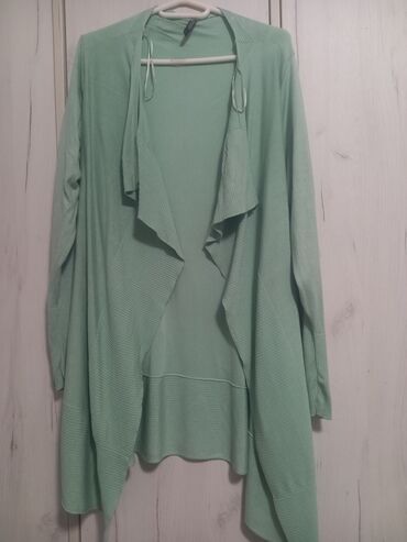 2) Svetlozeleni lagani kardigan od pletenog materijala. Kaskadni (vodopad) prednji deo bez kopčanja, dugi rukavi. Donji rub i delovi napred sa rebrastim pletenjem, duži bočni krajevi za lepršav efekat.