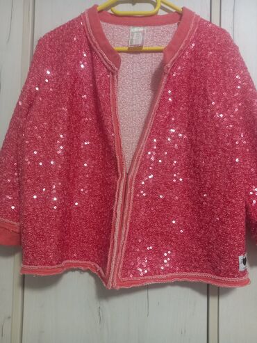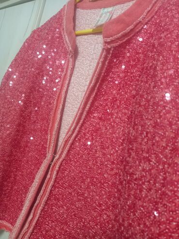 3) Kratki blejzer/kardigan u ružičasto‑koralnoj boji, sa sjajnim šljokicama po celoj površini. Okrugli izrez, otvoren prednji deo bez kopčanja, 3/4 rukavi. Mekana, teksturirana podloga, dekorativne ivice.