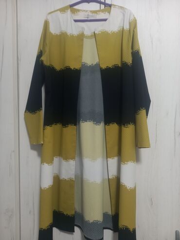 1) Dugi otvoreni kaput-kimono bez kopčanja, ravnog kroja i sa dugim rukavima. Tkanina sa finom teksturom i širokim horizontalnim prugama u maslinasto‑žutoj, crnoj, sivoj i beloj boji. Okrugli izrez, prednji deo blago se preklapa bez dugmadi/rajfešlusa.