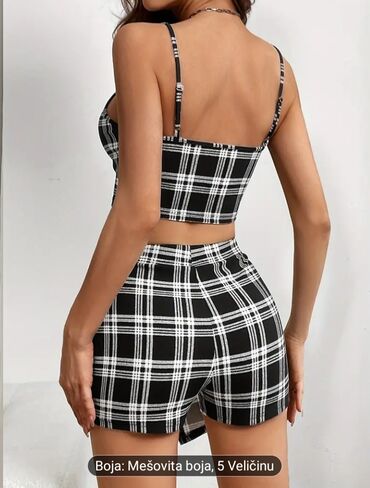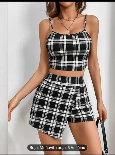 Dvodelni ženski komplet sa kariranim dezenom. Sastoji se od kratkog topa na bretele i šortsa-suknje nepravilnog kroja. Top je kratak, doseže do struka, sa tankim bretelama. Šorts-suknja ima preklop napred koji daje izgled suknje dok zadržava praktičnost šortsa. Karirani dezen je kombinacija crne i bele boje. Komplet je pogodan za letnje dane i ležerne prilike, pružajući udobnost i moderan izgled.