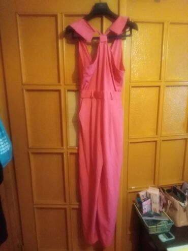 Elegantna ženska haljina/jumpsuit u jarkoj pink boji. Model sa halter-kragnom: široka kragna se spaja u centru ispod vrata dekorativnom vezom/čvorom, a prednji deo je blago naboran. Bez rukava, otvorenih ramena i leđa. Struk naglašen pojasom u istoj boji i materijalu. Donji deo dugačak, ravnog kroja sa blagim tapkanjem pri dnu. Tkanina glatka, lepršava, prijatna na dodir.