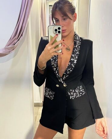 Crni bolero/sako sa dugim rukavima - Model: kratak bolero kroj koji se završava iznad struka, otvoren sprijeda bez kopčanja - Materijal: mekana, elastična tkanina prijatna za kožu (sintetički miks...