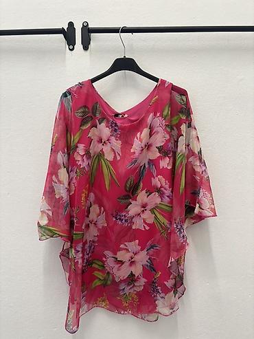 - Sheer kimono tunika od šifona: intenzivno roze podloga sa velikim tropskim/cvetnim printom u nijansama ružičaste, ljubičaste i zelene. Prozračan, lebdeći kroj sa spuštenim ramenima i asimetričnim rubom, široki rukavi do lakta. Idealna kao prekrivka preko topa ili kupaćeg.