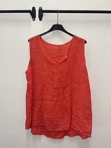 - Bezrukavni laneni top: koralno-crvena nijansa. Prirodna tekstura lana, okrugao izrez sa diskretnim preklopom, blago nabrana partija ispod grudi za opušten pad, produžen zadnji deo.