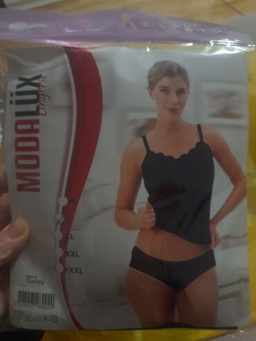 - Dizajn: top sa tankim bretelama i talasastim/čipkastim obrubom dekoltea; klasične gaćice sa punim zadnjim delom