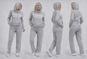 - Detalji kroja: opuštena silueta, kapuljača sa duplim slojem, rebraste manžetne; pantalone sa teksturom koja vizuelno izdužuje noge