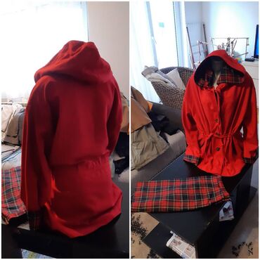 - Kaput sa kapuljačom, kopčanje na dugmad, podešavanje struka učkurom. Manžetne i unutrašnjost sa kariranim postavom.