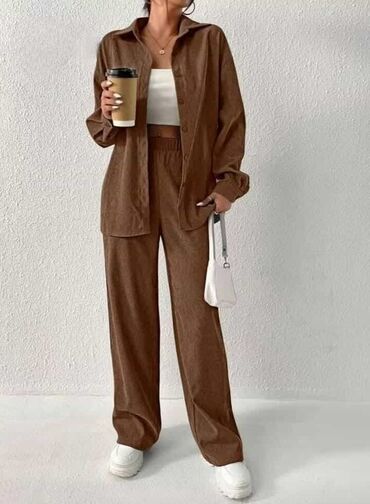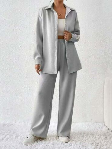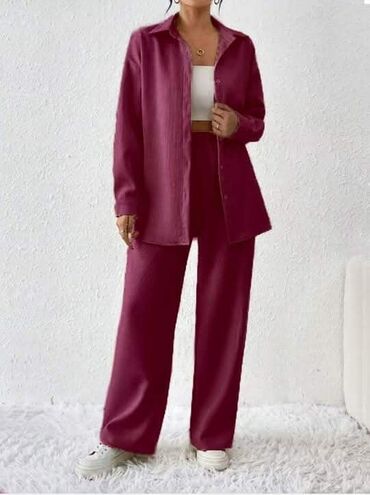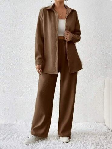 Kompletan ženski set koji se sastoji od košulje dugih rukava i odgovarajućih pantalona, idealan za ležeran, ali i udoban stil. Košulja je klasičnog kroja sa kragnom i kopčanjem na dugmad, dok su pantalone opuštenog kroja sa elastičnim pojasom za dodatnu udobnost. Komplet je dostupan u više boja, uključujući bordo, zelenu, crnu, sivu i braon, što ga čini pogodnim za različite prilike i kombinacije. Dugmad na košulji su u boji tkanine, što doprinosi minimalističkom i elegantnom izgledu. Široke nogavice pantalona omogućavaju slobodu kretanja i celodnevnu udobnost. Ovaj komplet je svestran izbor za svakodnevno nošenje, opuštene izlaske ili putovanja. Može se nositi zajedno za usklađen izgled ili kombinovati sa drugim komadima odeće.