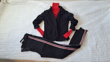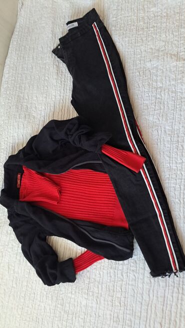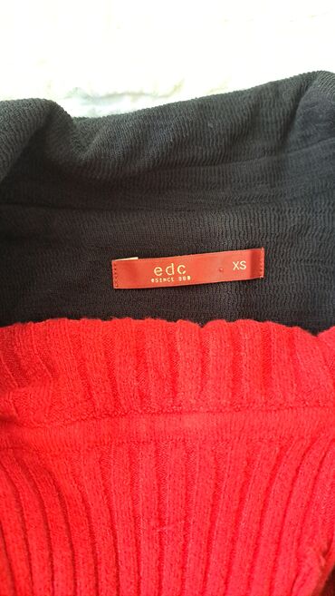 - Džemper: crveni, rebrasti, uski kroj sa rol-kragnom. Brend: edc (etiketa XS). Elastičan materijal koji lepo prijanja uz telo.