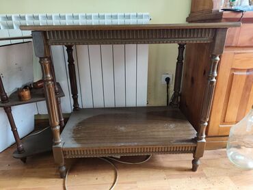 - Drveni sto/konzola sa dve police: masivna konstrukcija sa dekorativno profilisanim nogama i ukrasnim horizontalnim letvicama ispod gornje i donje ploče. Pravougaoni oblik, donja polica za odlaganje. Prirodna drvena završna obrada, pogodna kao pomoćni sto u dnevnoj sobi, hodniku ili za TV/uređaje.