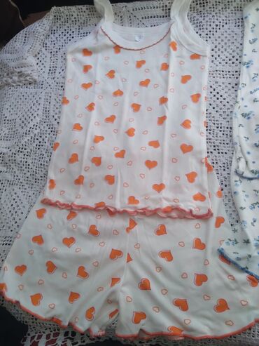 - Ženska pidžama/komplet za spavanje: majica na bretele i šorc od mekanog, laganog materijala. Bela podloga sa narandžastim motivima srca. Talasasti porub u narandžastoj boji na ivicama topa i šorca. Široke bretele, udoban kroj i prozračna tkanina, idealno za tople noći.