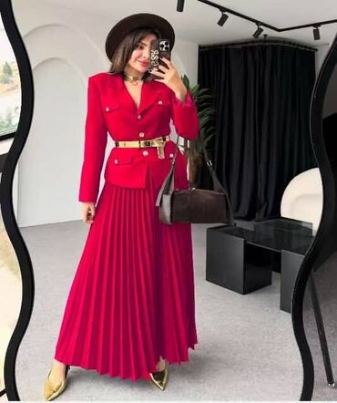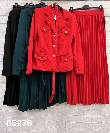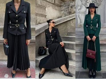 Elegantan ženski komplet koji uključuje sako i dugačku plisiranu suknju, idealan za različite prilike. Sako je krojen sa reverima, dugim rukavima i džepovima sa preklopom na prednjoj strani, ukrašenim zlatnim dugmadima. Suknja je dugačka, plisirana, sa širokim naborima koji joj daju lepršav izgled. Dostupan u više boja, ovaj komplet pruža sofisticiran i moderan izgled. Može se nositi sa kaišem za isticanje struka, čineći ga pogodnim za poslovne sastanke, svečane događaje ili svakodnevne kombinacije.