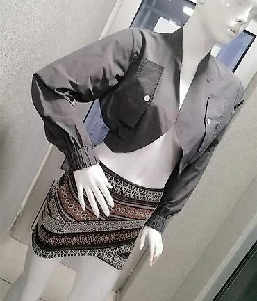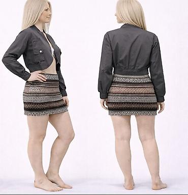 Komplet koji se sastoji od kratke jakne i suknje sa etno motivima. Jakna je sive boje, kratkog kroja, sa dugim rukavima koji se završavaju ranflom. Ima džepove na grudima. Suknja je mini dužine, sa raznobojnim etno šarama.