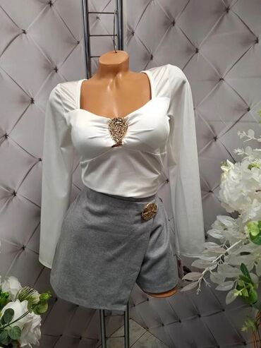 LetnjaZimskaElegantna ženska kombinacija – beli top i sivi šorts sa ukrasnim detaljima.