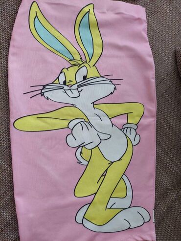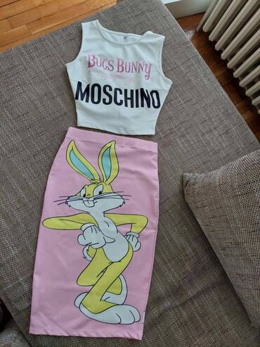 - Donji deo: uska midi suknja u svetloružičastoj boji, sa velikim Bugs Bunny printom preko cele prednje strane. Visok struk, rastegljiv materijal, ravni porub.