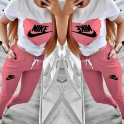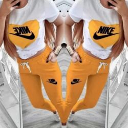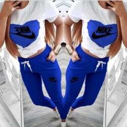 - Dvodijelni set: bela majica sa velikim printom NIKE na prednjoj strani i usklađene trenerke.