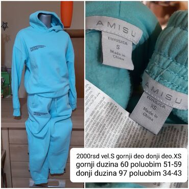 - Donji deo: veličina XS; dužina 97 cm; poluobim struka 34–43 cm (elastični pojas)